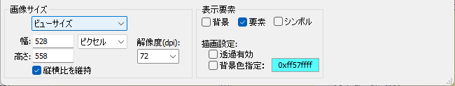 背景(背景設定)、要素、シンボル(方位記号、座標軸)を含めるかを設定します。