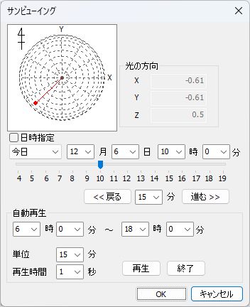 ビューの視点位置を太陽光の方向に設定して表示を行う機能です。