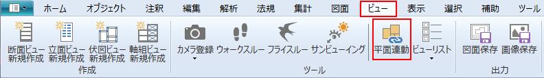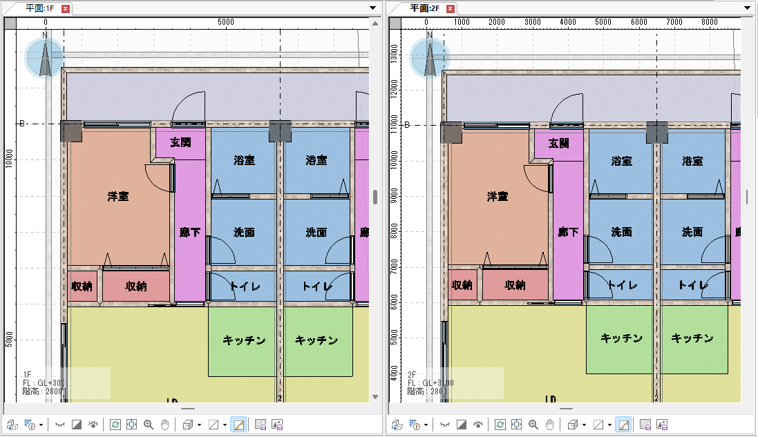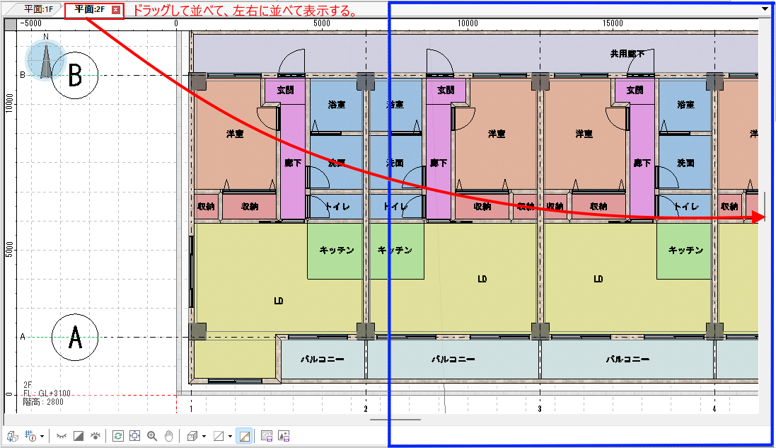 比較したい平面ビューを2個表示します。(例えば、1Fと2F)
