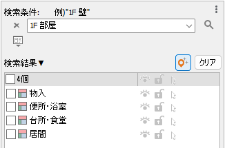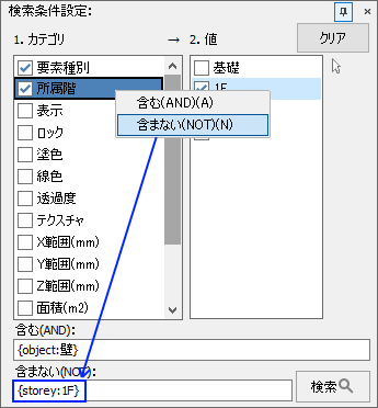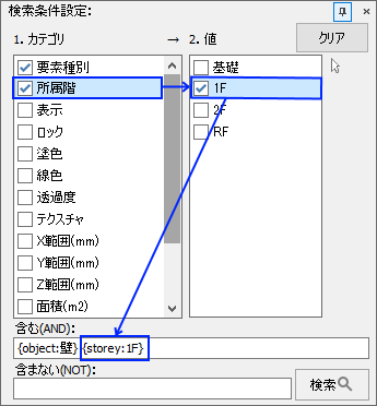 検索条件は、例えば、"1階 壁"と入力すると、1階の壁が検索されますが、