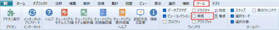 リボンメニュー[ツール]→[検索]