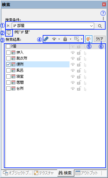①検索条件入力欄、検索ボタン 入力欄に入力して ②検索オプションボタン オプションダイアログで詳細な検索ができます。 ③検索結果リスト 検索を実行すると、結果がリストに表示されます。 ④操作ボタン リストの選択(チェック)アイテムに対する操作を実行します。 ⑤ハイライトボタン チェックをON ⑥リストのクリアボタン 検索結果リストをクリアします。 ⑦設定ボタン 履歴をクリア:検索条件の履歴をクリアします。 |