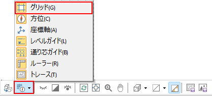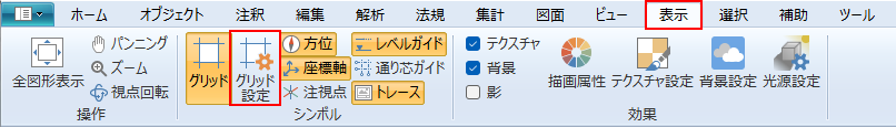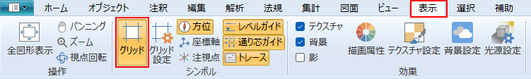 グリッドの表示切り替えはリボンメニューやビューツールバーから行うことができます。