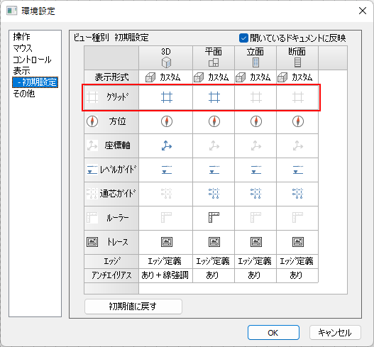 環境設定で新規作成でグリッドの表示状態を設定することができます。