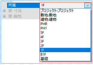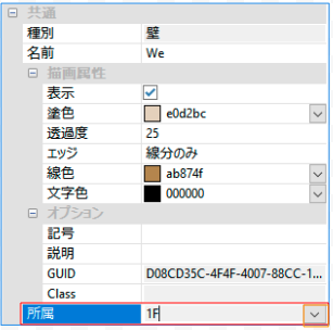 要素を間違えた階に入力したときや階に入力したあとに外構要素に変更したい場合などに所属変更操作を行うことができます。作業画面より、編集対象の要素を選択します。要素を選択するとプロパティウィンドウ上に属性情報が表示されます。表示された属性情報の「共通」→「所属」の項目から編集します。