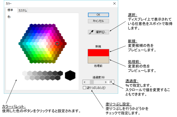 塗色を表示/設定します。16進数でRGB値[ffffff]6桁の表記です。 |