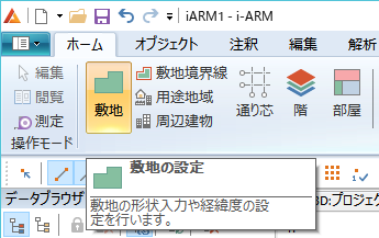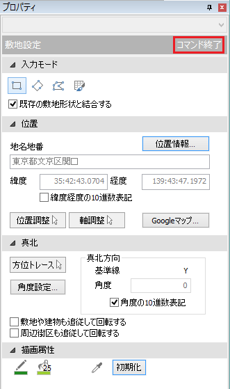 [敷地の設定]コマンドの入力・編集パラメータを設定するコントロールが表示されます。 各コマンド共通で、右上の[コマンド終了]ボタンでコマンドを終了することができます。 (ビュー上で右クリックからもコマンドを終了することができます) |