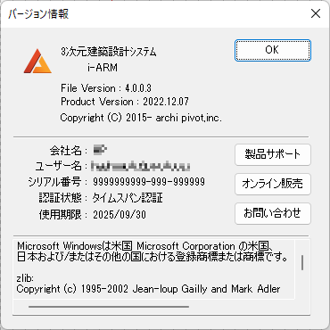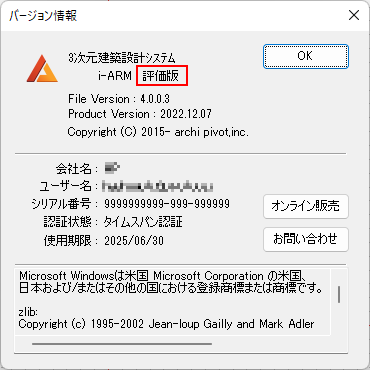 バージョン情報ダイアログが表示され、認証状態を確認することができます。