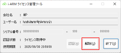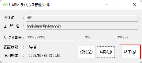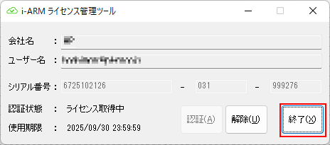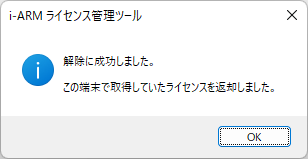 インターネットが接続された状態で、i-ARMの終了した場合は、自動でライセンスの返却が行われますので、返却作業をしていただく必要はありません。