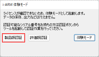 シリアル番号の入力をせずにインストールを行った場合など、ライセンス認証が完了していない場合は、i-ARM起動時に下のようなメッセージが表示されます。