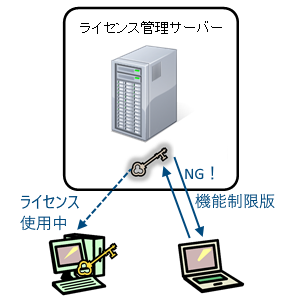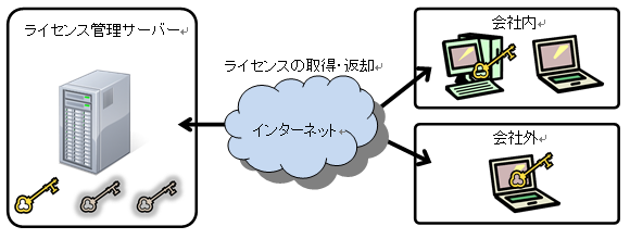 「タイムスパン認証」とは、使用期限が設定されているライセンス情報をパソコン単位で取得や返却を行う認証方法です。ライセンスの有効性を弊社ライセンス管理サーバーに問い合わせるため、インターネット接続が必要になります。