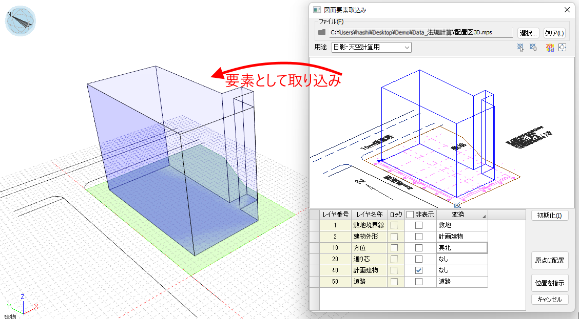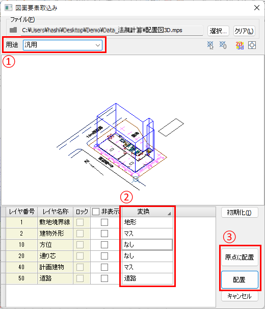 1)用途を選択します。 汎用: 汎用的にi-ARMの要素として取り込みます。 日影・天空計算用: 天空率コマンド、日影規制コマンドで計算を実行するための、立地条件を取り込みます。 ※法規タブから実行した場合は、[日影・天空率計算用]に切り替わっています。 2)変換要素を設定します。 変換する要素をレイヤごとに選択します。 ※1)で選択した用途によってリストの項目が異なります。 3)[配置]ボタンをクリックします。 [原点に配置]:原点位置に要素を配置します。 [配置]:ビュー上で配置位置を指示します。 |