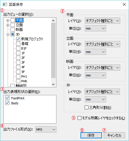 ②出力時のレイヤ、単位の設定