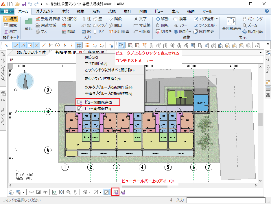 または、ビューツールバーの「ビュー図面保存」のアイコンをクリックして実行します。