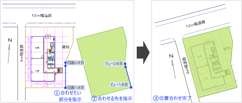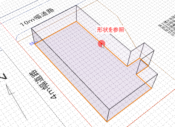 また、敷地形状、マス、引き伸ばしコマンドでは、トレース図を参照した入力機能があります。
