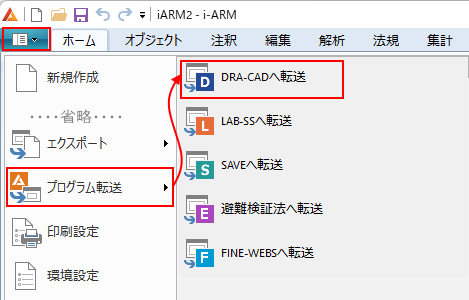 「ファイルメニュー」→「プログラム転送」→「DRA-CADへ転送」を実行します。