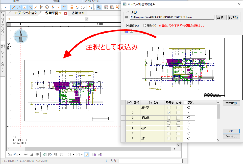 指定した図面ファイルに存在する2次元図形を注釈データとして取り込むことができます。