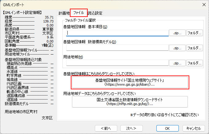 こちらでは、基盤地図情報のデータ選択、読み込み範囲の設定を行います。