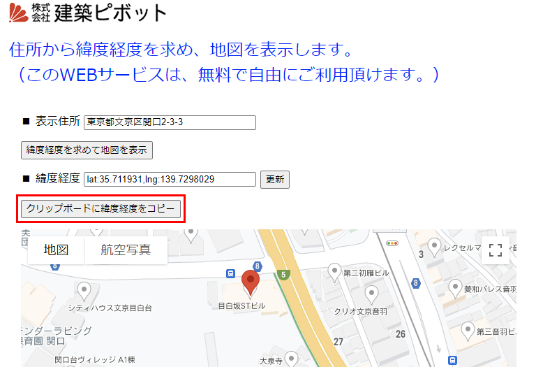 [クリップボードに緯度経度をコピー]をクリックし、ブラウザを閉じます。