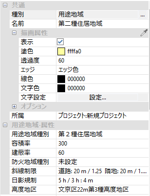 例えば、用途地域を選択してプロパティを確認すると、各用途地域の用途地域種別、容積率、建蔽率のデータが設定されていることが確認できます。