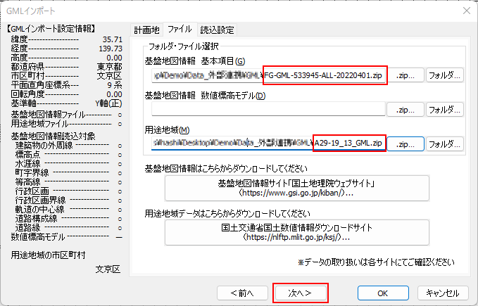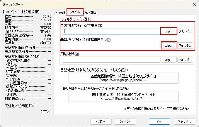 GMLインポートコマンドに戻り、「ファイル」タブで、①でダウンロードした基盤地図情報のzipファイルを選択します。
