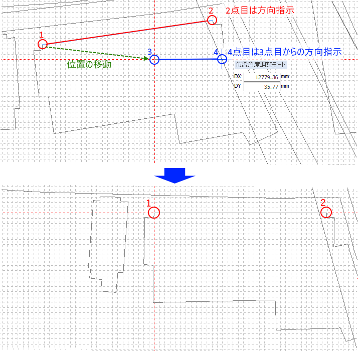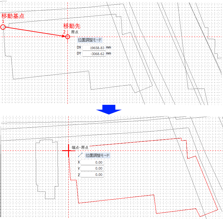 GISデータの位置を移動します。移動基点→移動先の位置を指示します。