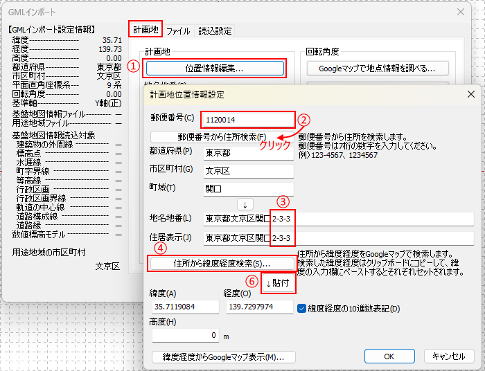 地図データを読み込むためには、計画地の緯度経度の情報が必要です。
