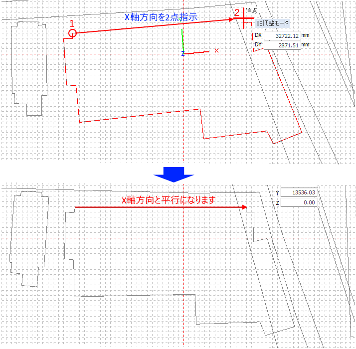 X軸の方向を指示して、GISデータを回転させます。