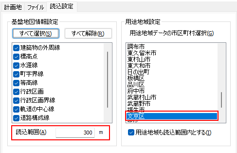 地図データ、用途地域データのファイルを設定しましたら、[読込設定]タブに移動します。