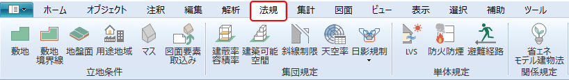 リボンメニューの[法規]タブをクリックすると関連するコマンドが表示されます。