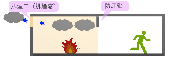 建築物の内部で火災が発生したときに、発生した煙や有毒ガスが広がるのを防ぐため、煙を一定区画に閉じ込めて、速やかに建物外に排出する必要があります。