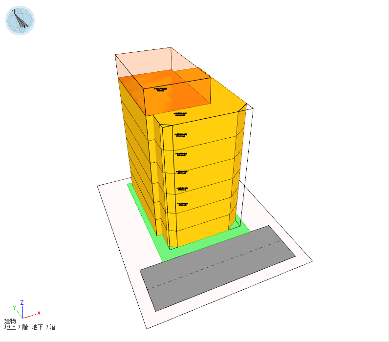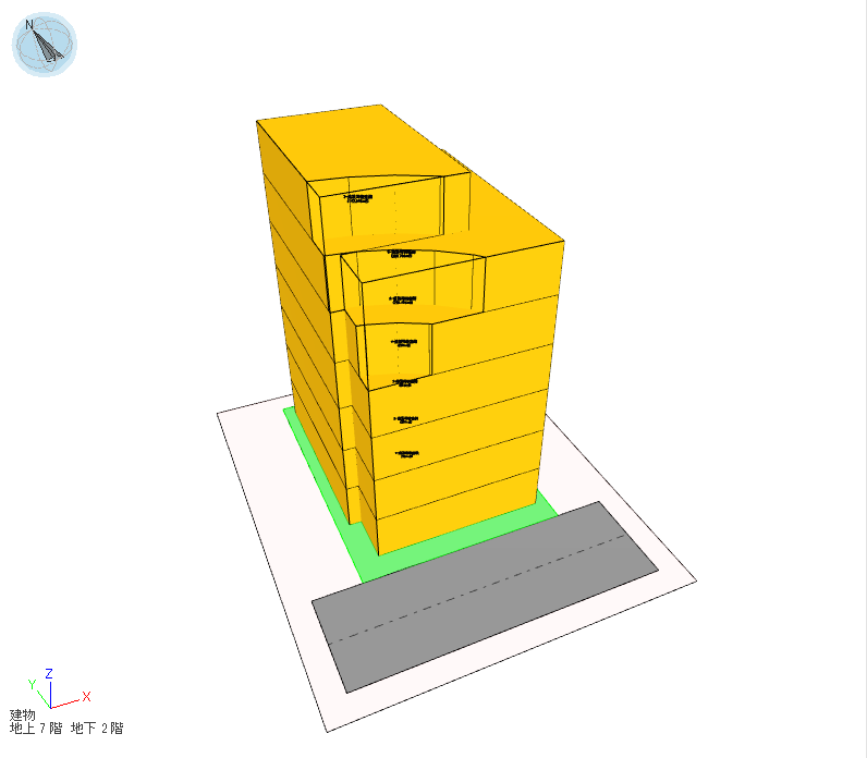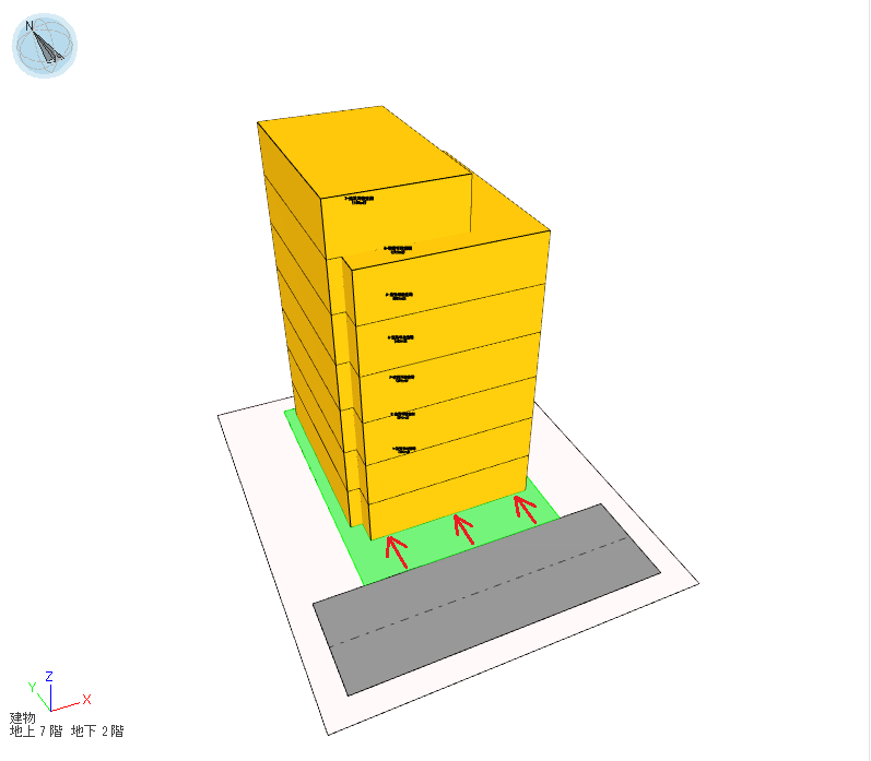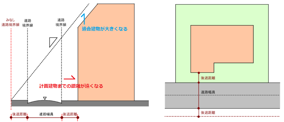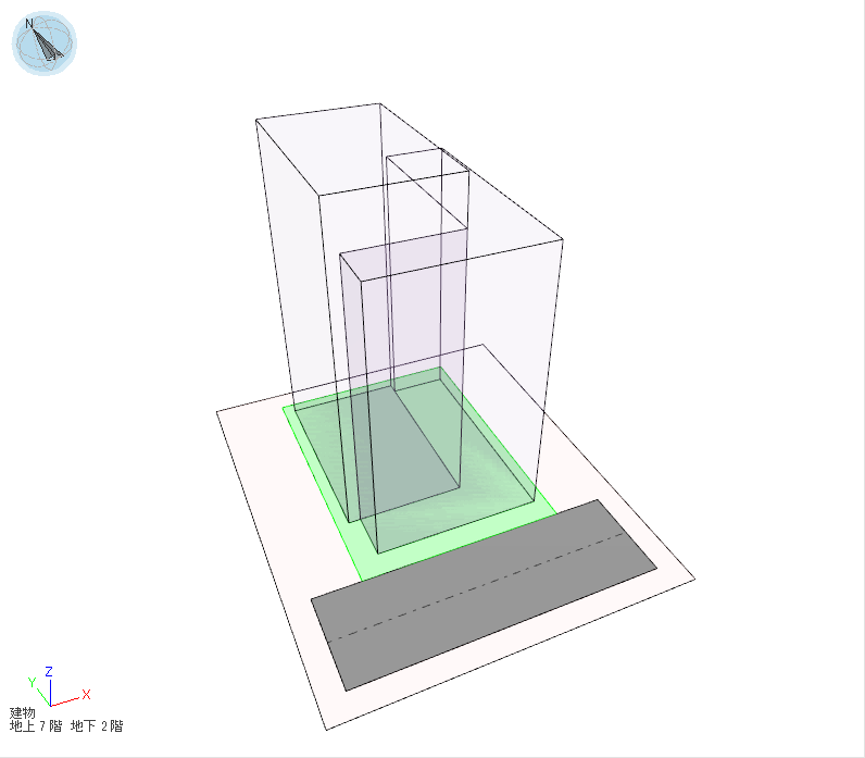 敷地境界線から見た建物の前後方向を調整する考え方です。斜線制限では敷地境界線と建物の距離である後退距離に応じて緩和が適用でき、天空率計算時にもこの緩和を使用して適合建物を作成することができます。計画建物の天空率が適合建物の天空率を下回った場合、対象となる敷地境界線から建物までの後退距離を大きくしていき、再計算を行います。計画建物の天空率が適合建物の天空率を上回っていたら計算を終了し、後退した建物またはその部分を削除します。この算定方法は他の手法と比べて整形な形状が保たれやすい傾向があります。