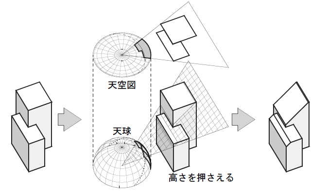 逆天空率計算は、天空率に適合するように建物の形状を切削する考え方です。次の3つの考え方で切削を行います。