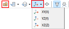 投影面が2軸と平行(XY面、XZ面、YZ面と平行)の場合に、残りの1軸に平行な直線群のみが消点を作ります。 左の図は投影面がXY面と平行になっています。 i-ARMでは3Dビューでパース表示時に、 平面表示、または座標系表示切替の表示状態にすると、1点透視となります。