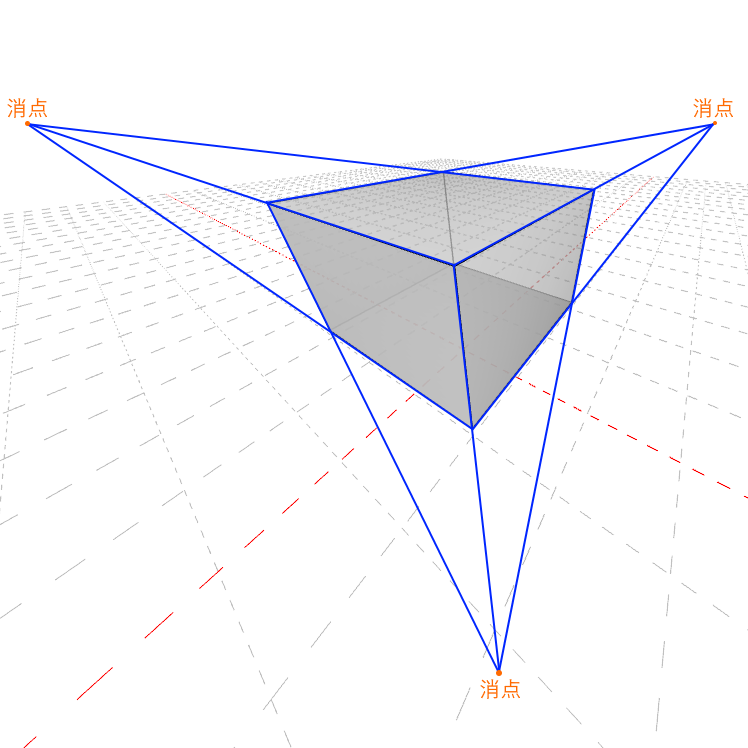 投影面がx,y,zのどの軸にも平行でないとき、各軸に平行な直線群が消点を作ります。 |