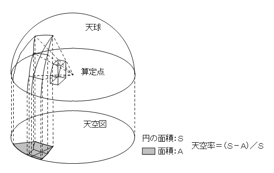 ある算定点から見ることのできる天空(空)の内、計算対象となる建築物に遮られることなく実際に見ることのできる範囲の割合を示します。