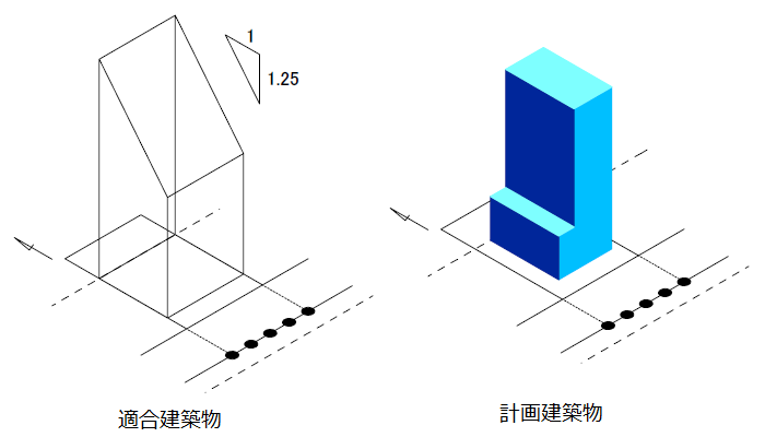 同一地点で計画建築物の天空率を求めて上記の天空率と比較すれば、計画建築物が斜線制限と同等の周辺環境の良好度を保っているかを確認できます。