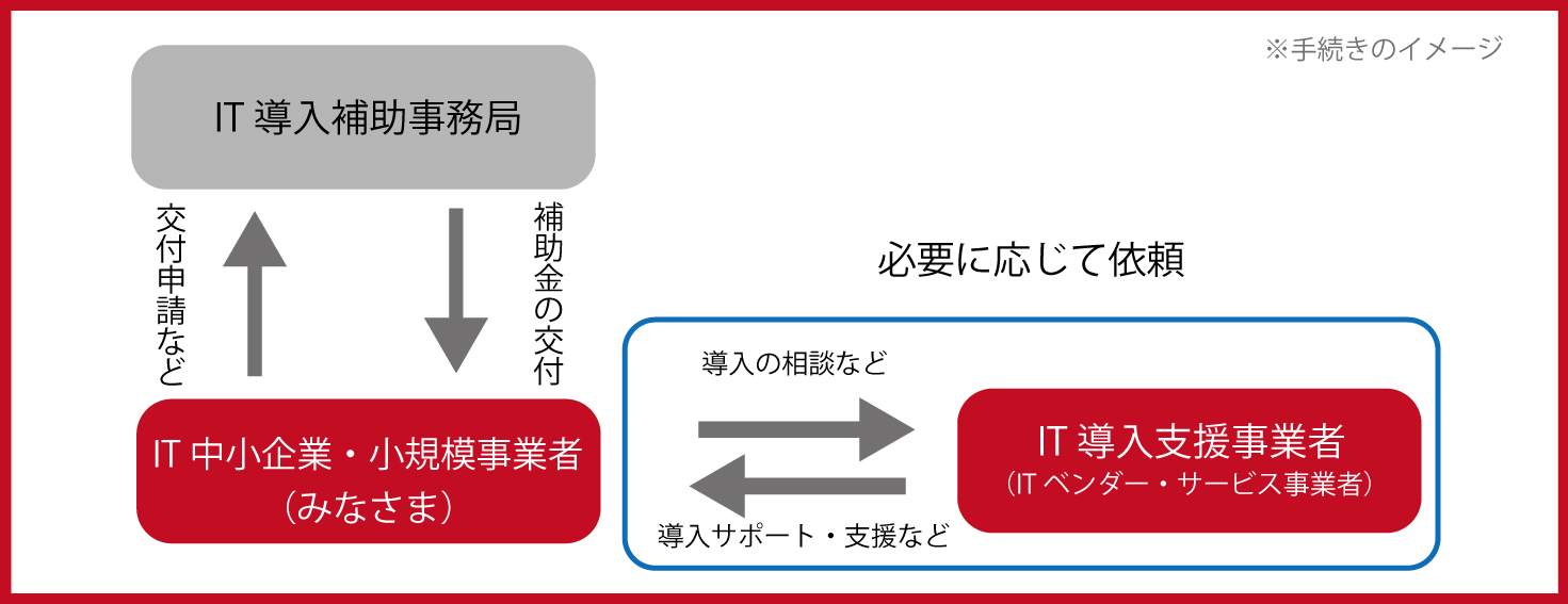 ITツール導入に関する相談、申請・導入後のサポート・アフターフォローは、登録されたIT導入支援事業者が行います。